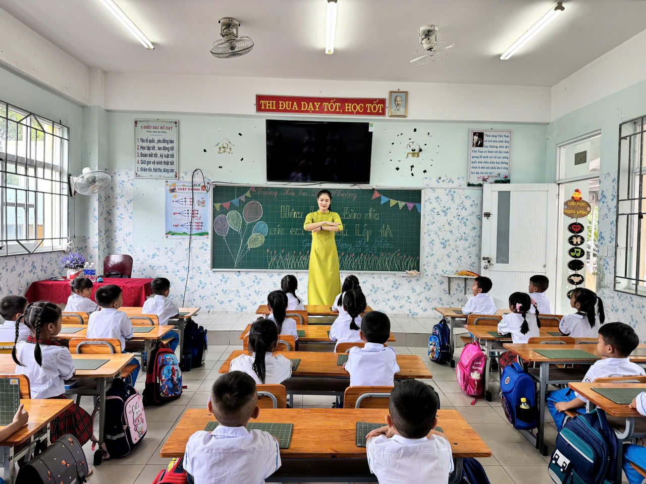 Cô giáo cẩn thận trang trí bảng để chào đón học sinh