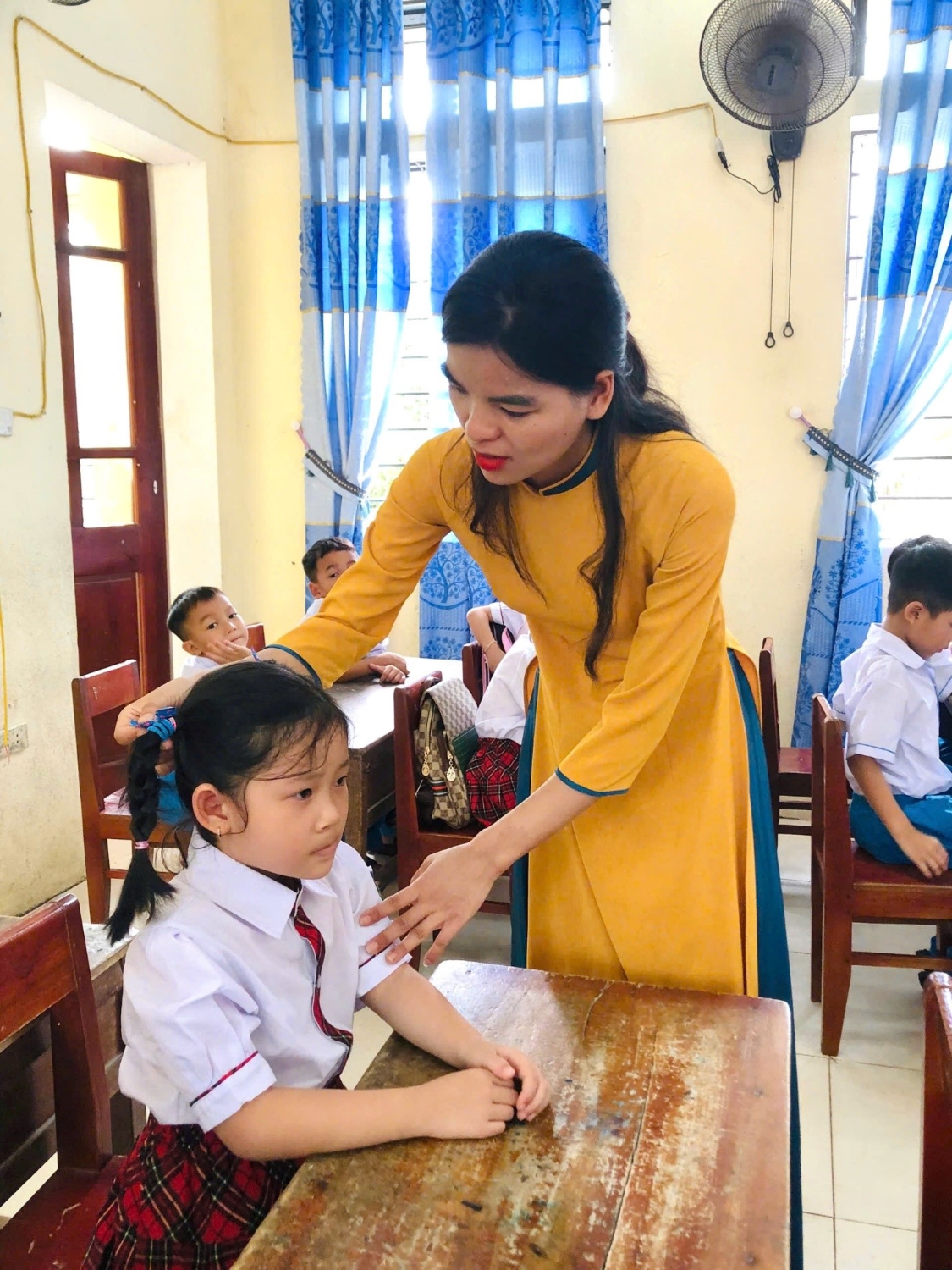 Cô giáo hướng dẫn các em tham quan các phòng học
